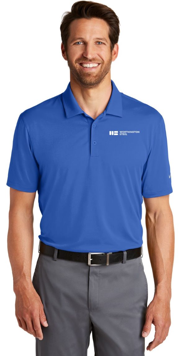 Nike Royal Blue polo w/ white WS logo embroidered on left chest. This sophisticated polo has a subtle, grid-like texture and is engineered with Dri-FIT moisture management technology; self-fabric collar, three-button placket with dyed-to-match buttons and open hem sleeves. The Swoosh design trademark is on the left sleeve. Made of 4.2-ounce, 100% polyester Dri-FIT fabric.