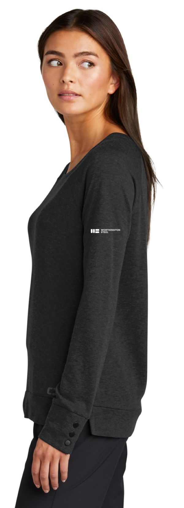 OGIO Black Scoop Neck L/S Top w/ embroidered WS logo in white on left sleeve; Soft hand 4.9-ounce, 85/15 poly/merino wool; Double-knit with polyester wool jersey face and polyester mesh back; Raglan sleeves; Matte black metal 3-snap cuffs.