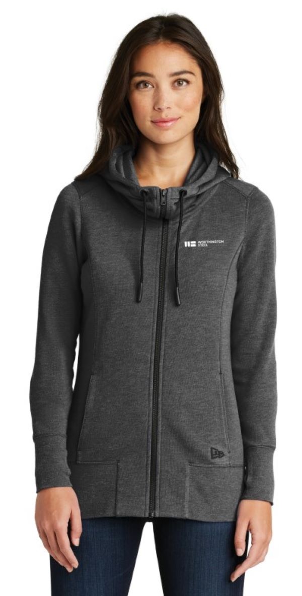 New Era Black Heathered Tri-Blend Full Zip Fleece w/ white embroidered WS logo on left chest; 7.1-ounce, 55/34/11 cotton/poly/rayon fleece; Zip-through neck; Front pouch pockets; Rib knit cuffs and hem; Thumbholes