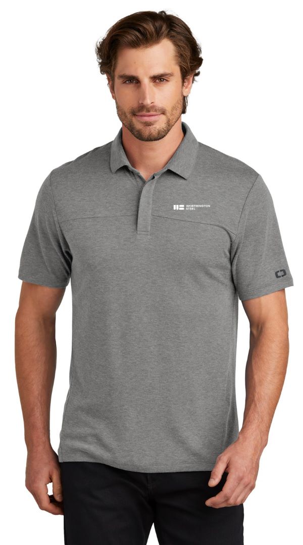 OGIO Grey Polo w/ white embroidered WS logo on left chest; 4.9-ounce, 85/15 poly/merino wool; Double-knit with polyester wool jersey face and polyester mesh back; Self-fabric collar; 3-button placket; chest seam